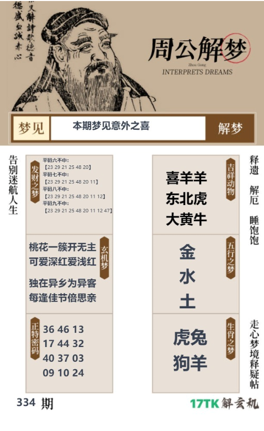 334期 (梦见意外之喜)桃花一簇开无主,可爱深红爱浅红,独在异乡为异客,每逢佳节倍思亲 解梦七肖:牛猴虎狗鼠龙蛇 解梦一码:17 解梦十码:17.10.16.20.18.14.01.15.11.35 332期 (梦见闭关修炼)春风又绿江南岸,明月何时照我还,云想衣裳花想容,春风拂槛露华浓 解梦七肖:马牛蛇鸡猪猴鼠 解梦一码:12 解梦十码:12.17.13.33.19.10.18.14.11.47 331期 (梦见夜不能寐)青海长云暗雪山,孤城遥望玉门关,黄沙百战穿金甲,不破楼兰终不还 解梦七肖:蛇兔鼠马牛龙猪 解梦一码:13 解梦十码:13.15.18.30.24.17.14.07.21.11 330期 (梦见暗藏玄机)飞流直下三千尺,疑是银河落九天,京口瓜洲一水间,钟山只隔数重山 解梦七肖:牛鸡龙虎狗鼠猴 解梦一码:17 解梦十码:17.21.26.16.20.18.10.19.11.23 |